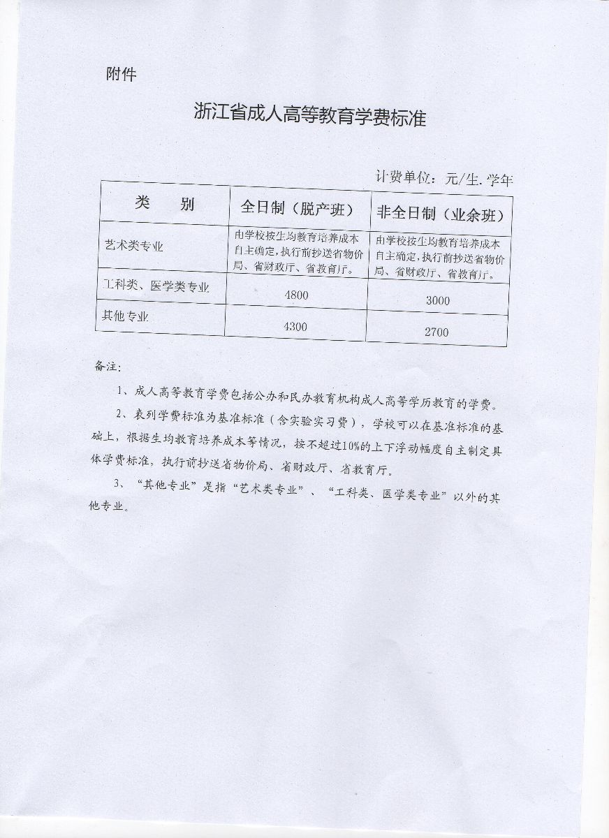 日前,浙江省物价局发布了《关于调整成人高等教育收费标准的通知》,从2015年春季新生入学起开始执行.根据该《通知》,调整之后,工科类、医学类专业全日制成人教育学费为4800元/生学年。工科类、医学类专业非全日制成人教育学费为3000元/生学年。“艺术类专业”学费标准,由学校按生均实际培养成本自主确定。另外,“非艺术类专业”学费标准,各学校可根据实际,以基准标准为基础,在上下浮动10%的幅度内确定各专业具体学费标准。